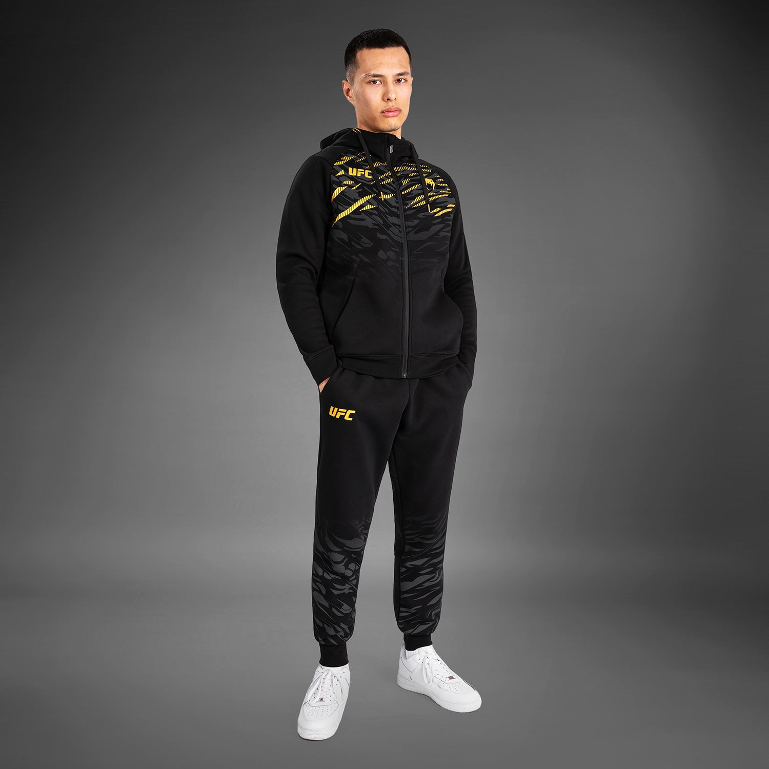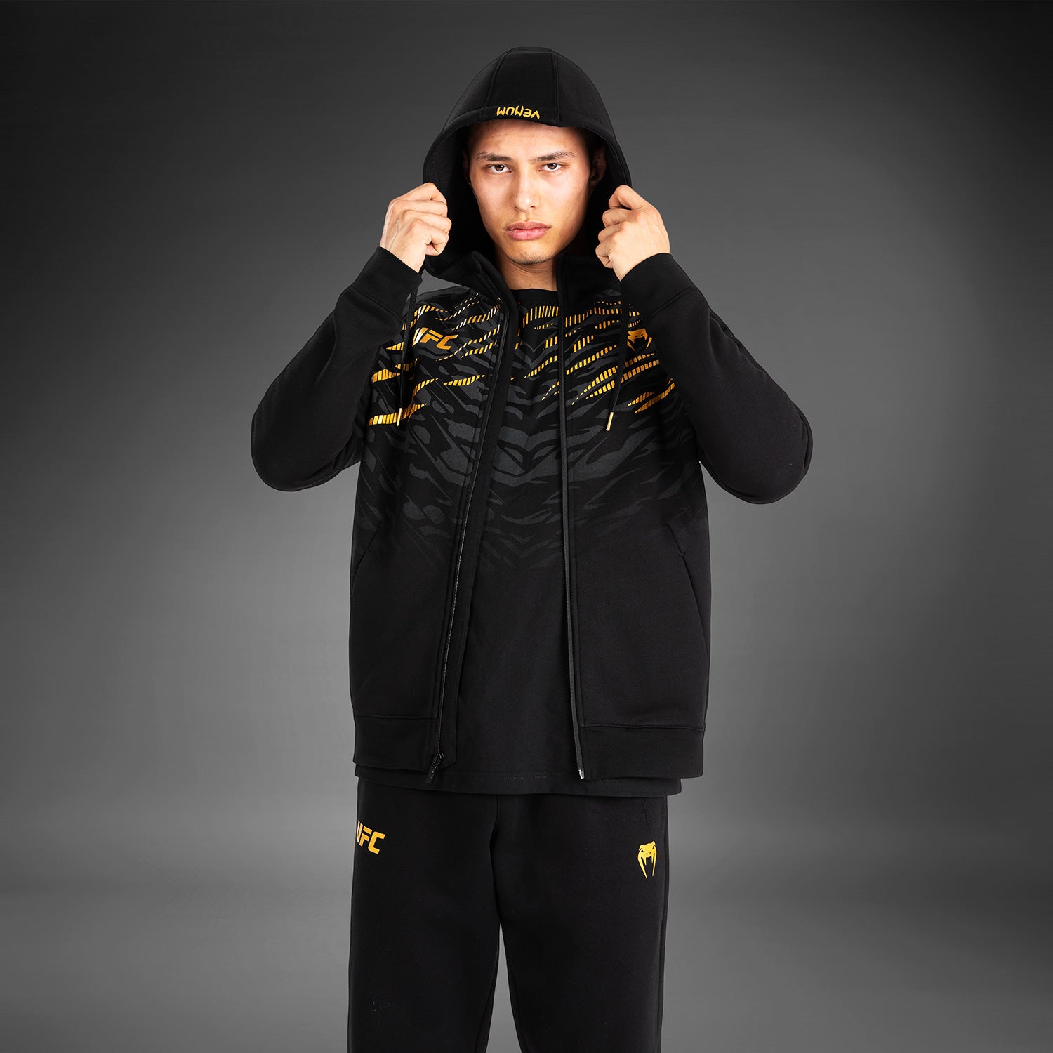 UFC Fusion by Venum メンズレプリカジップフーディは、オープンサイドポケットとドローストリングフードを特徴としています。VenumとUFCのロゴが胸とフードに施されています。このブラック/ゴールドのカラウェイは、UFCチャンピオン専用です。