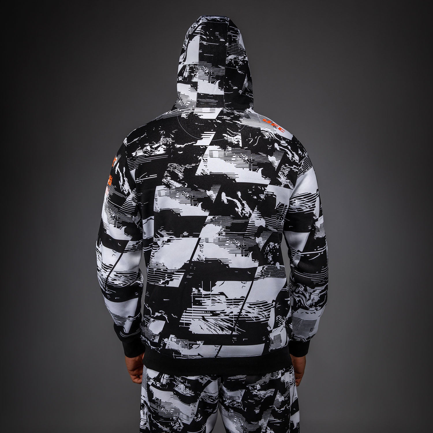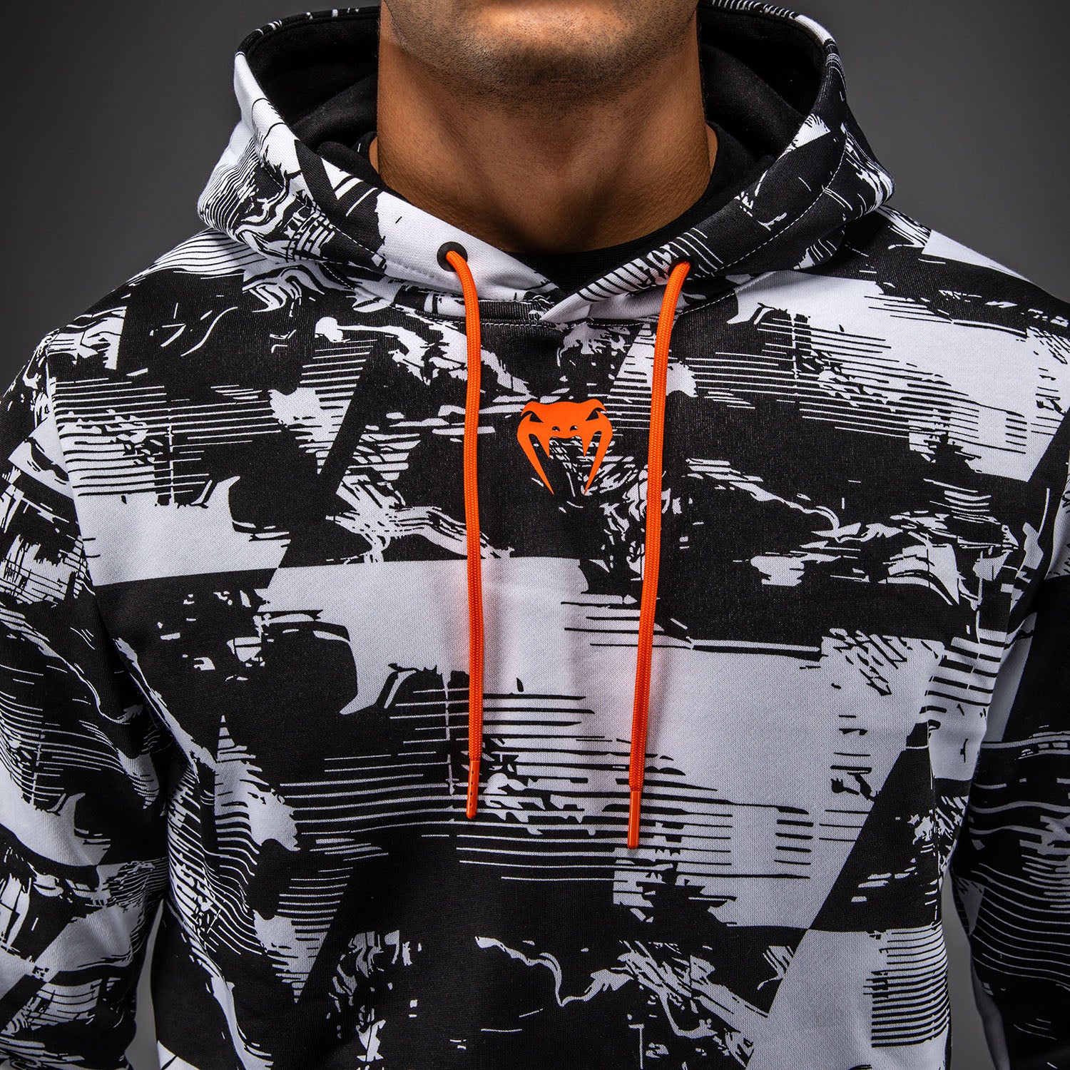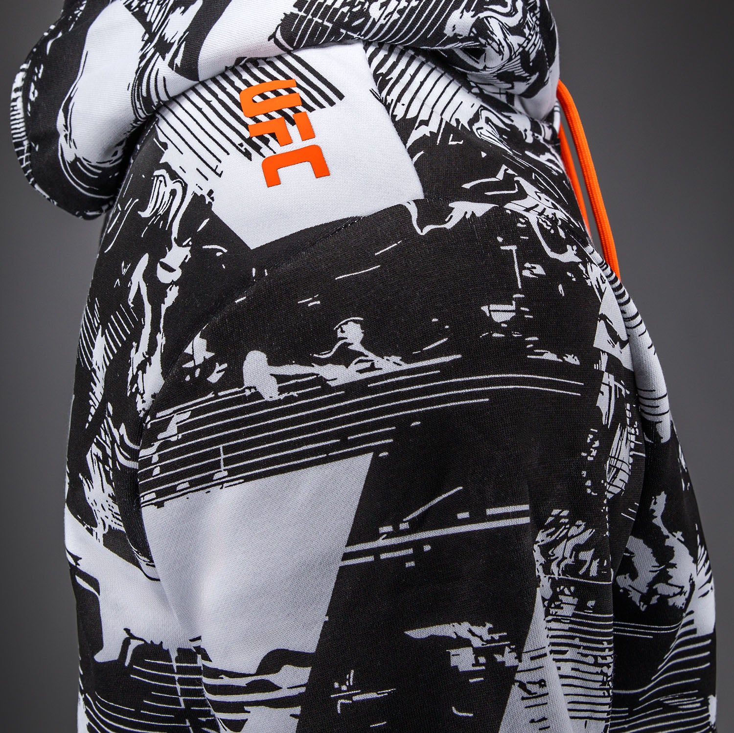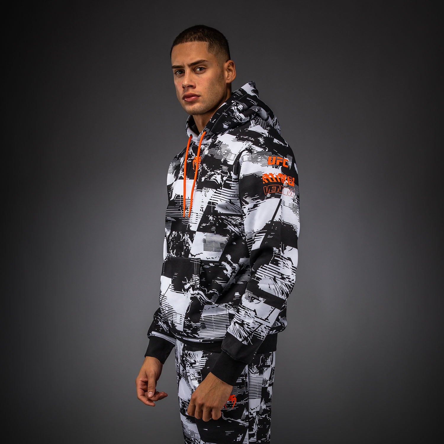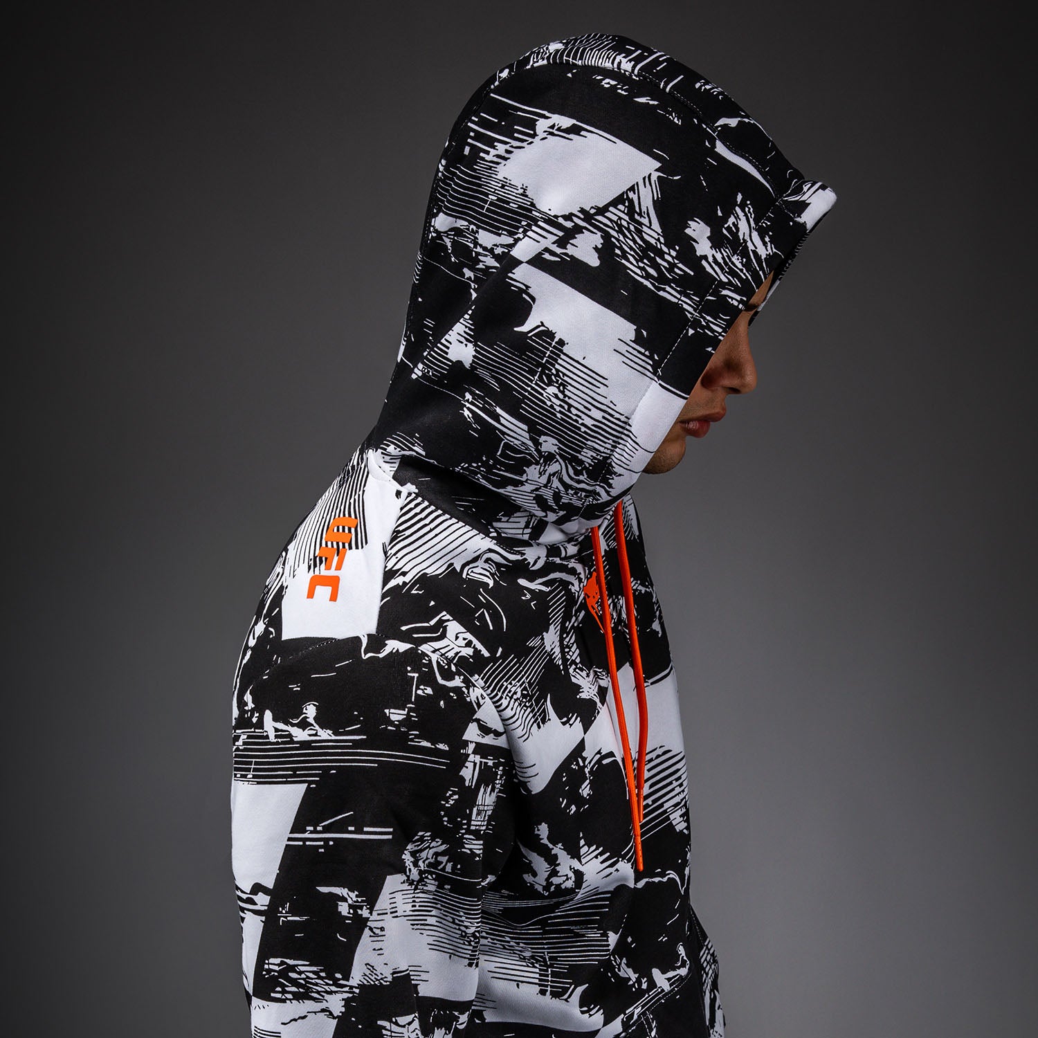 メンズUFC Zenith by Venum Fight Weekプルオーバーフーディーは、胸部、左腕、右肩の後ろにブランドロゴを配置。カンガルースタイルの前ポケットとドローストリングフードが、プレミアムな仕上がりを演出します。