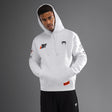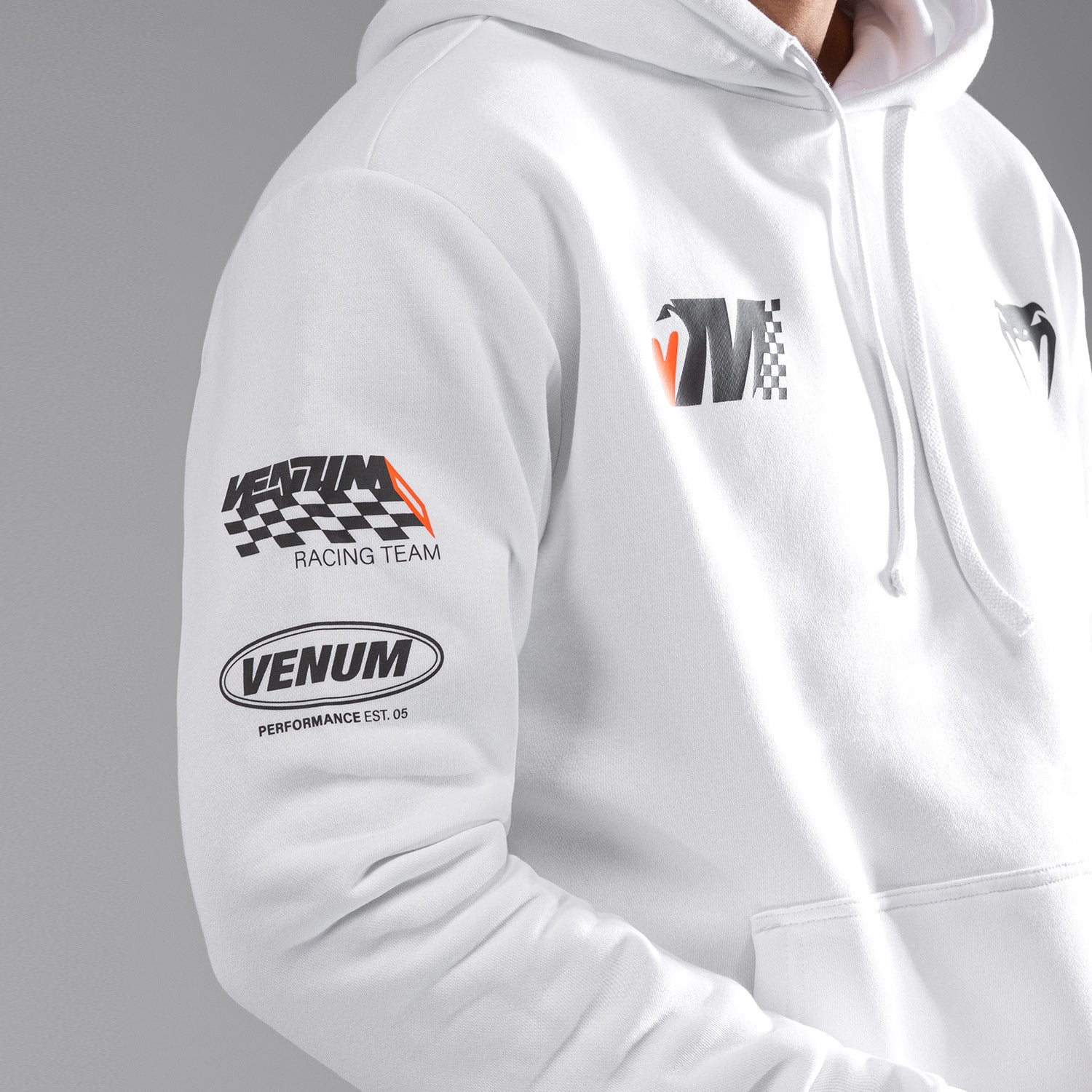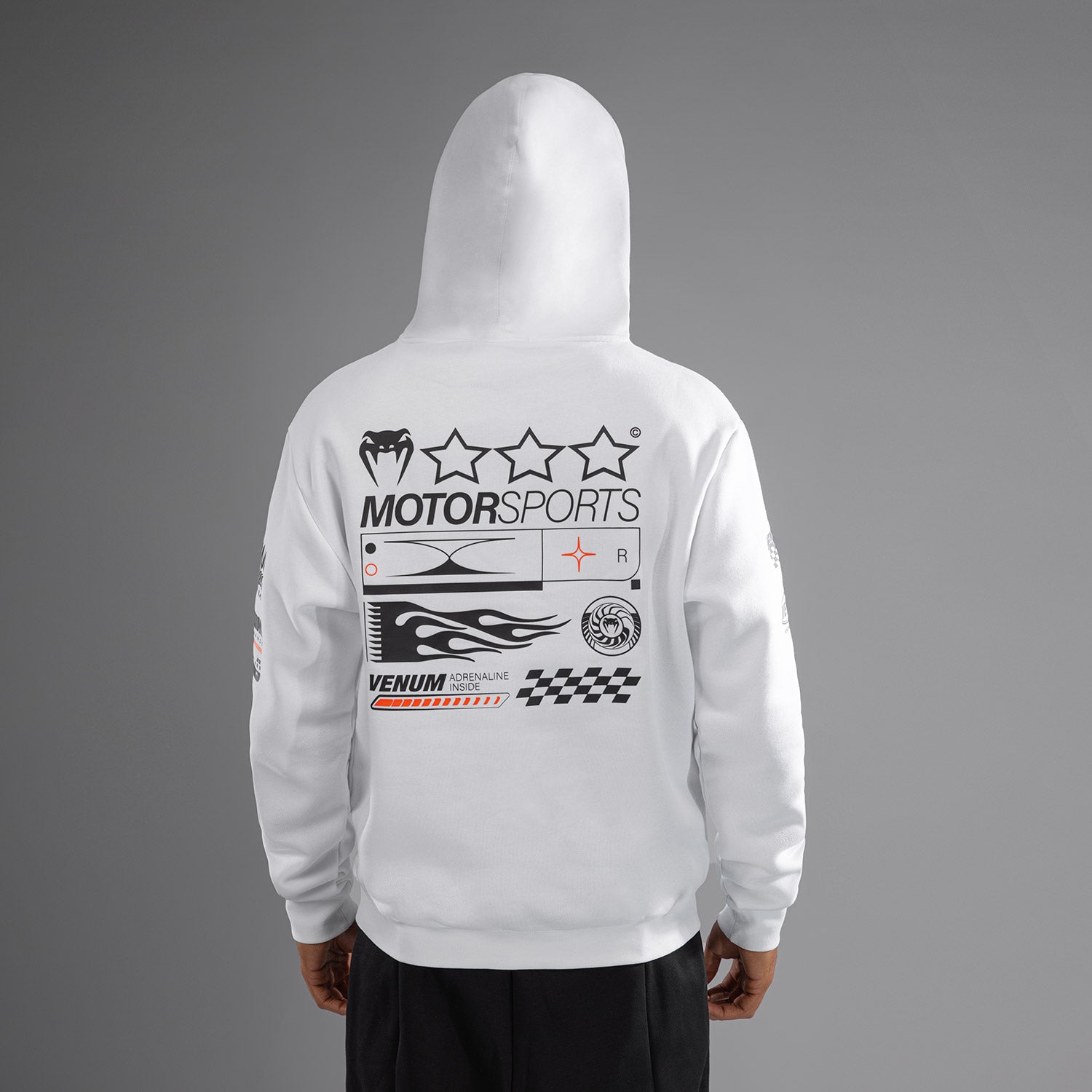 スノーホワイトのベヌムモータースポーツフーディは、カンガルーポケットとドローストリングフードを備えたレギュラーフィットのプルオーバーです。ベヌムモータースポーツに触発されたオレンジとホワイトのプリントと刺繍パッチが特徴のこのフーディは、トラックに出る準備が整っています!