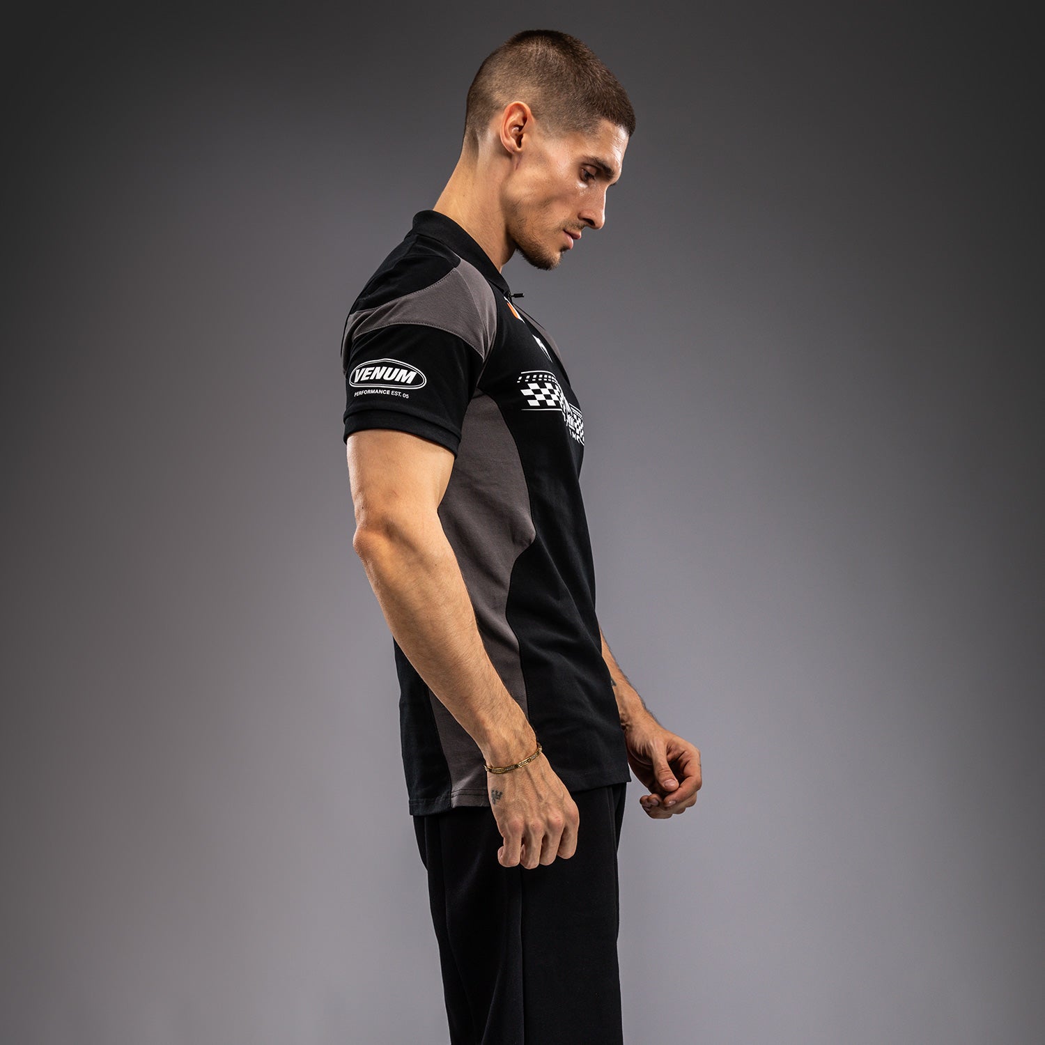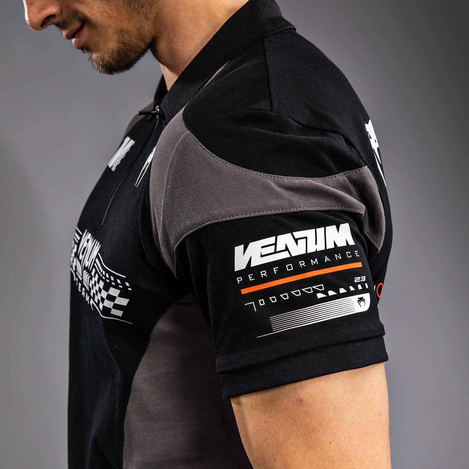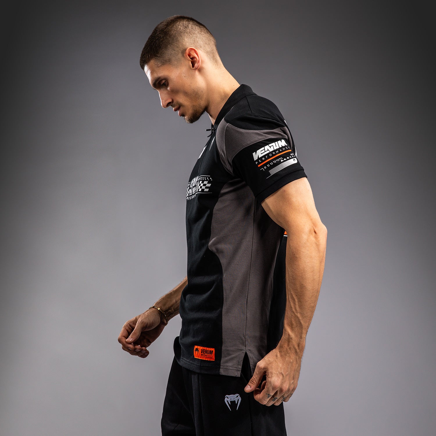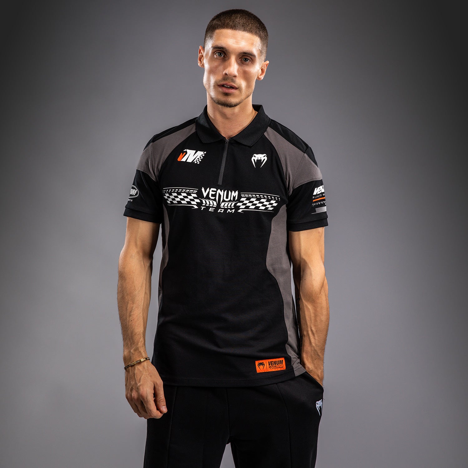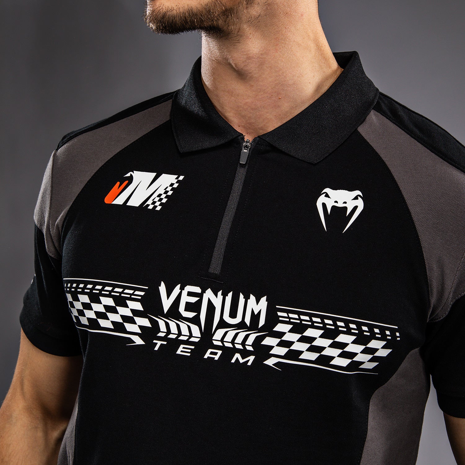 ディープブラックのヴェヌムモータースポーツコットンポロシャツは、トラックで着用されるパフォーマンスシャツにインスパイアされたもので、ジッパー付きの襟があります。オレンジと白の印刷および刺繍パッチがヴェヌムモータースポーツにインスパイアされており、このポロシャツはトラックに出る準備が整っています!