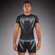 サミュエルは身長185cmで、TシャツはMサイズ、パンツはLサイズを着用しています。胸囲:99cm / ウエスト:81cm。