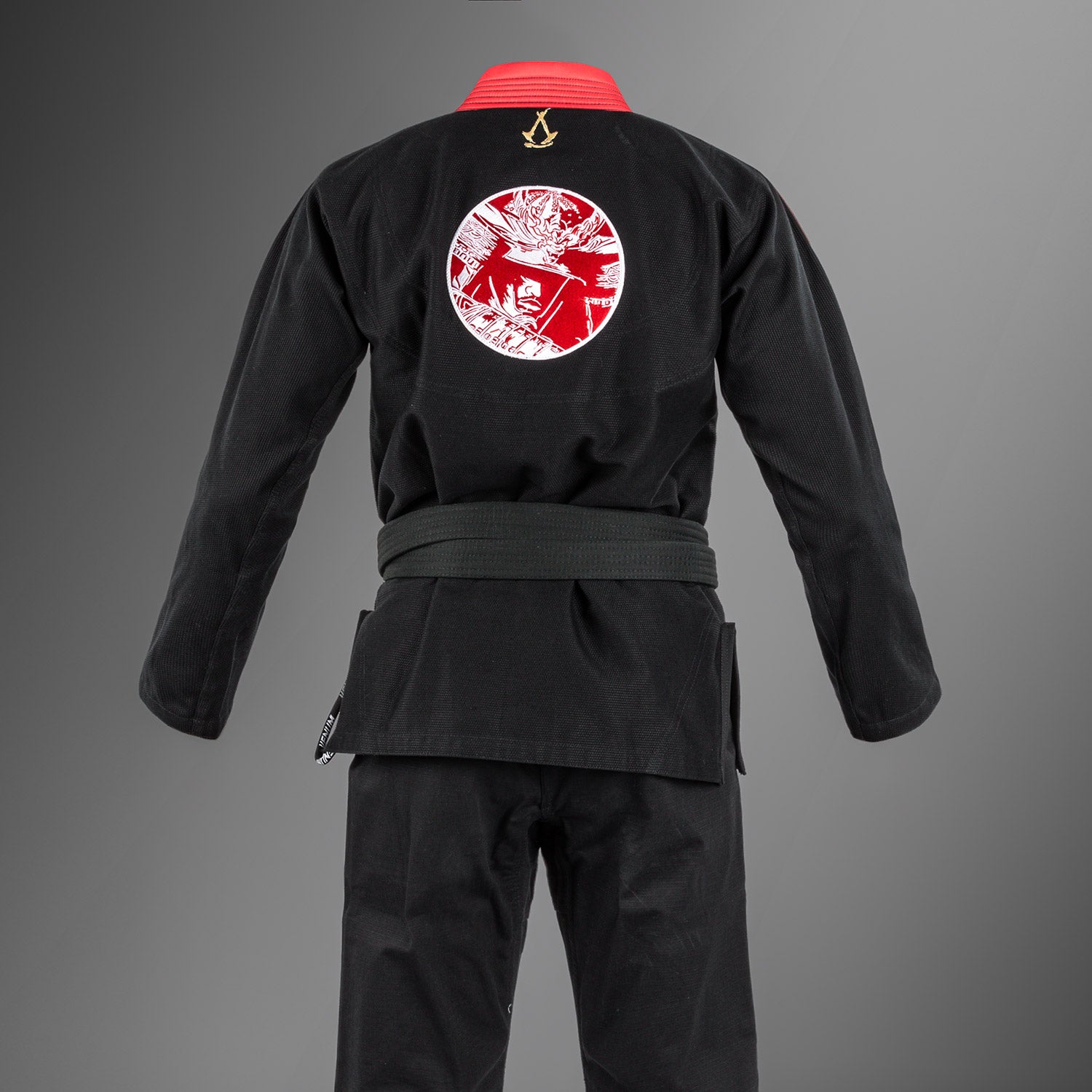 Venum x Assassin's Creed: Shadows BJJ Giの印象的なデザインは、大胆な赤とゴールドの刺繍と、弥助の堂々としたサムライキャラクターからインスパイアされたグラフィックが取り入れられています。